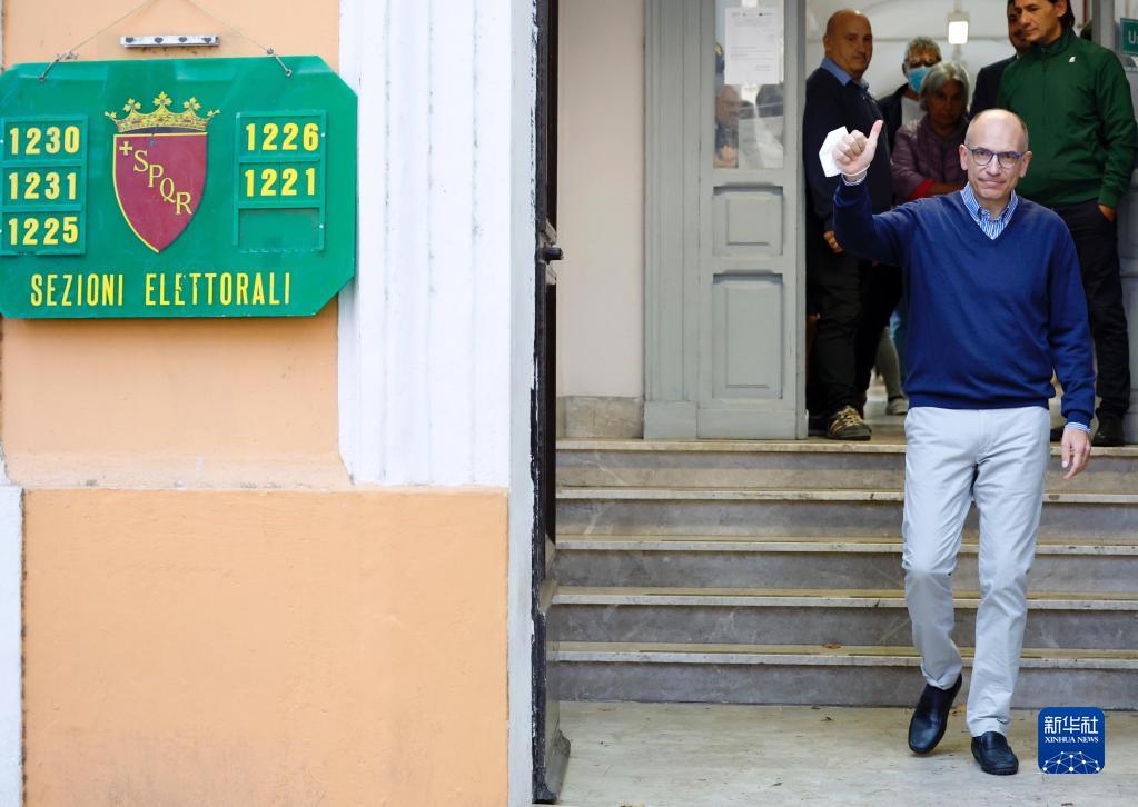 9月25日,意大利前總理、民主黨領(lǐng)導人萊塔投票后走出羅馬一處投票站。
