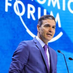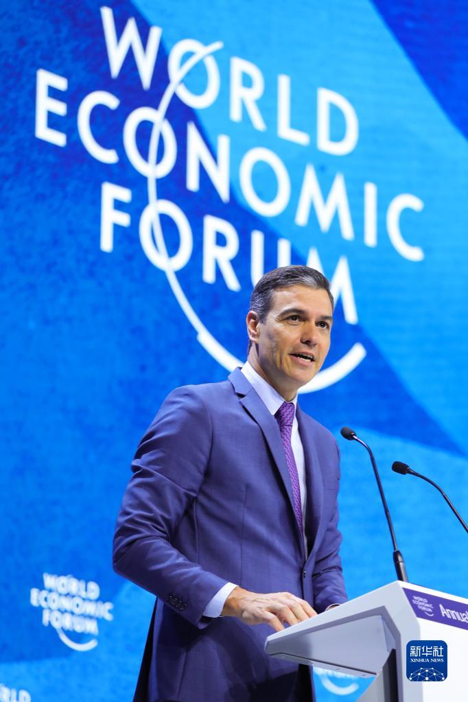 這是2022年5月24日,在瑞士達沃斯,西班牙首相桑切斯出席世界經(jīng)濟論壇年會(huì )時(shí)致辭。