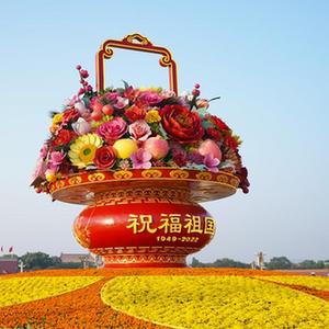 國慶節臨近,“祝福祖國”巨型花果籃亮相北京天安門(mén)廣場(chǎng)。今年“祝福祖國”巨型花果籃頂高18米,以喜慶的花果籃為主景,花壇底部直徑48米。