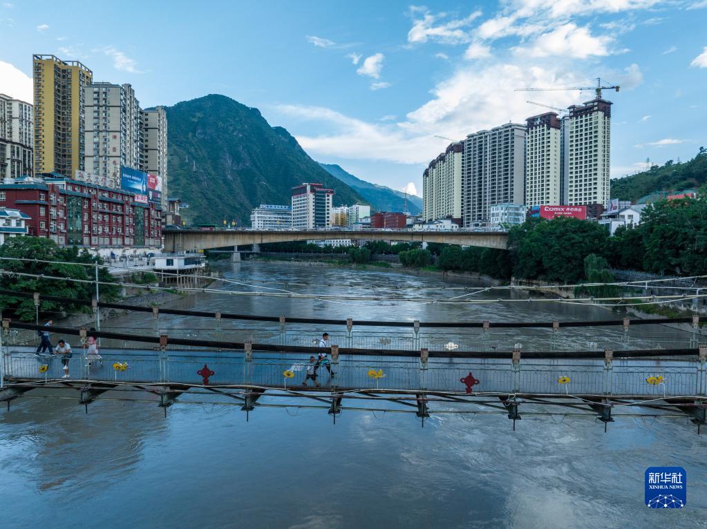 2022年9月14日,怒江州瀘水市六庫街道居民在橋上散步(無(wú)人機照片)。新華社記者 江文耀 攝
