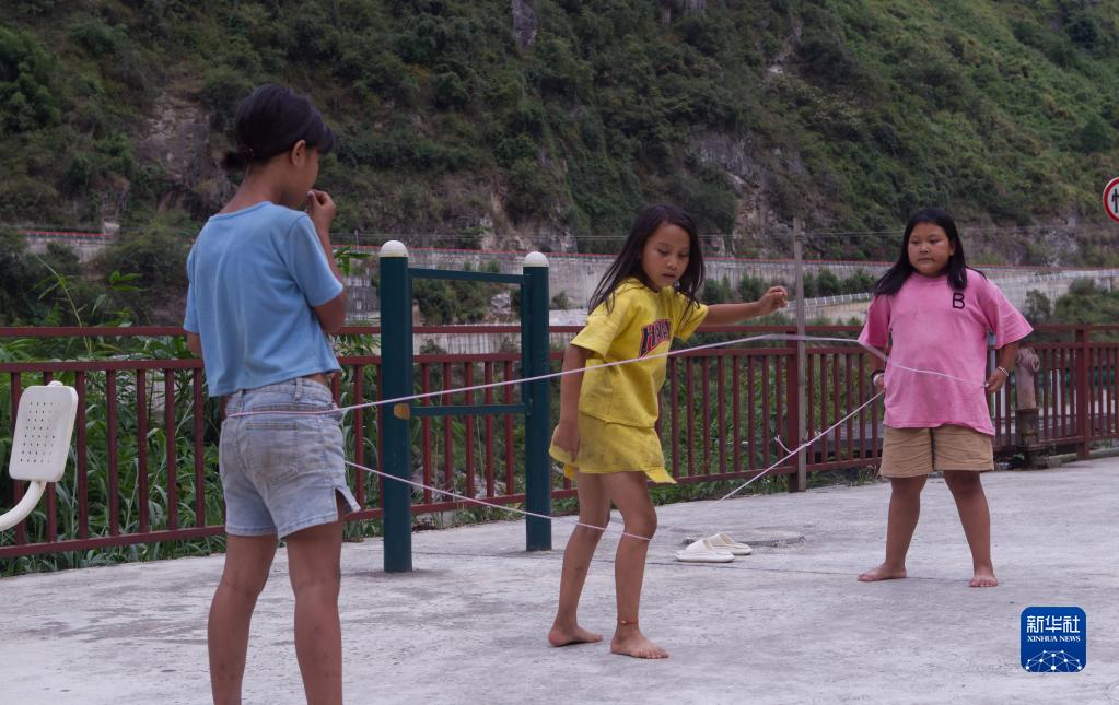 2022年9月14日,怒江州福貢縣托坪村五湖易地扶貧搬遷安置點(diǎn)的小朋友在江邊跳皮筋。新華社記者 岑云鵬 攝