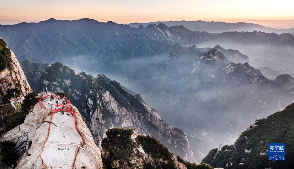 9月25日,游人在西岳華山西峰頂上游覽(無(wú)人機照片)。