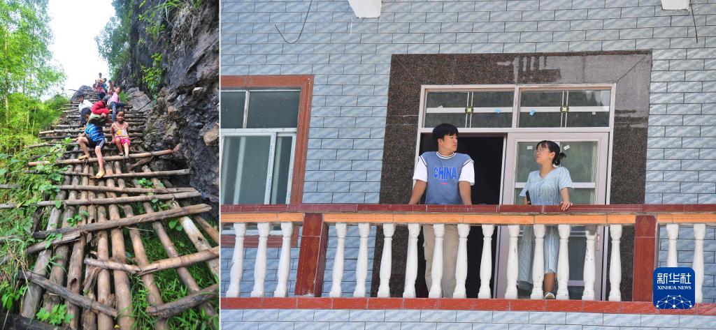 左圖:在廣西大化瑤族自治縣板升鄉弄勇村弄頂屯,弄勇小學(xué)三年級學(xué)生藍春香(前右)爬“天梯”去上學(xué)(2012年9月3日攝);右圖:即將上大學(xué)的藍春香(右)向學(xué)長(cháng)蒙宣任了解大學(xué)生活(2022年8月23日攝)。目前,弄勇村已經(jīng)屯屯通公路(拼版照片)。