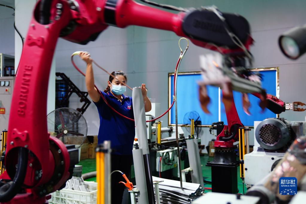 9月25日,在惠民縣德潤杰(山東)紡織科技有限公司,工作人員在生產(chǎn)膠輥膠圈。