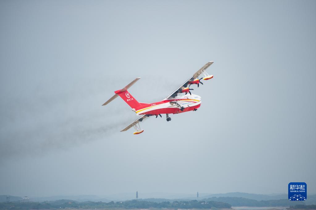 當日,由我國自主研制的大型水陸兩棲飛機“鯤龍”AG600M,以全新紅色消防涂裝在湖北省荊門(mén)市漳河機場(chǎng)完成12噸投汲水試驗。