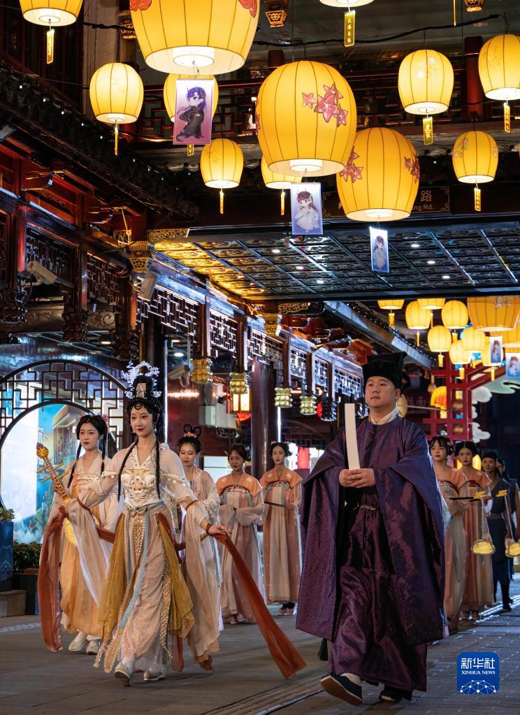 金秋時(shí)節,夜幕降臨的上海豫園商城上演江南仲秋游園場(chǎng)景,給市民和游客帶來(lái)一場(chǎng)浪漫的國風(fēng)沉浸式體驗。