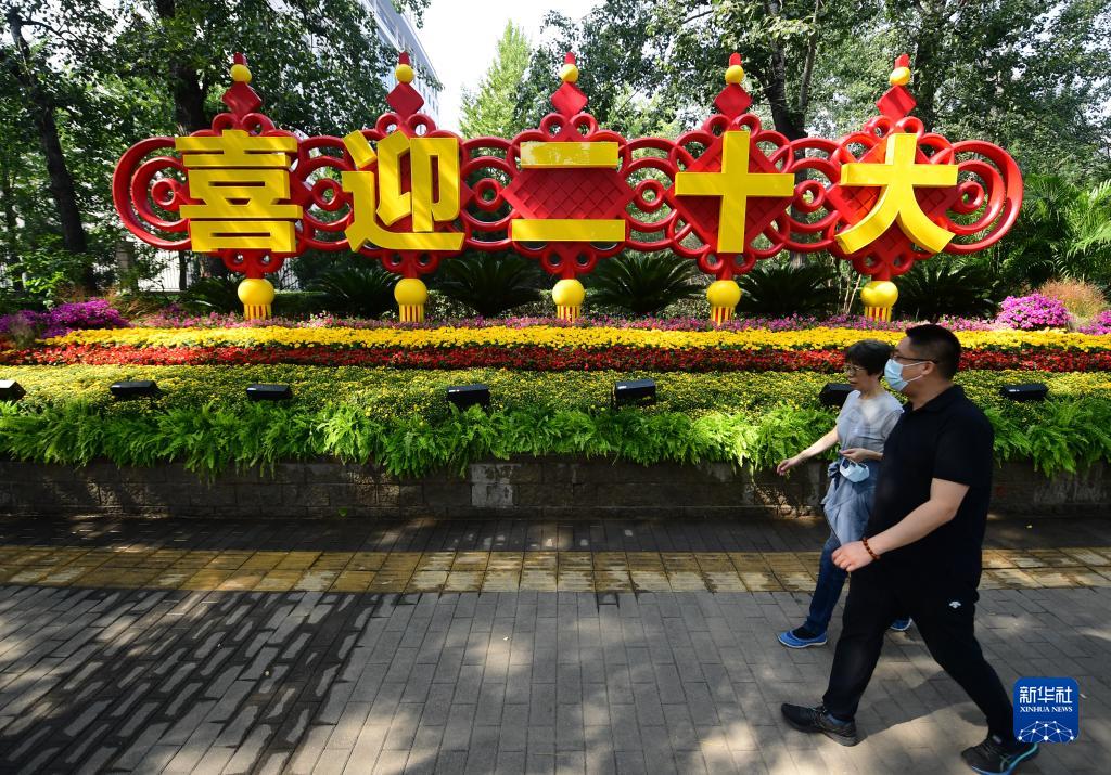 9月27日,市民從京西賓館附近的“喜迎二十大”花壇前走過(guò)。