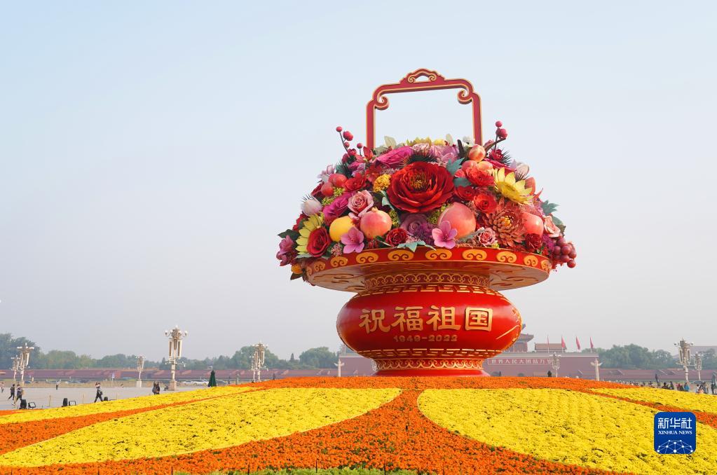 9月27日在天安門(mén)廣場(chǎng)拍攝的“祝福祖國”巨型花果籃。