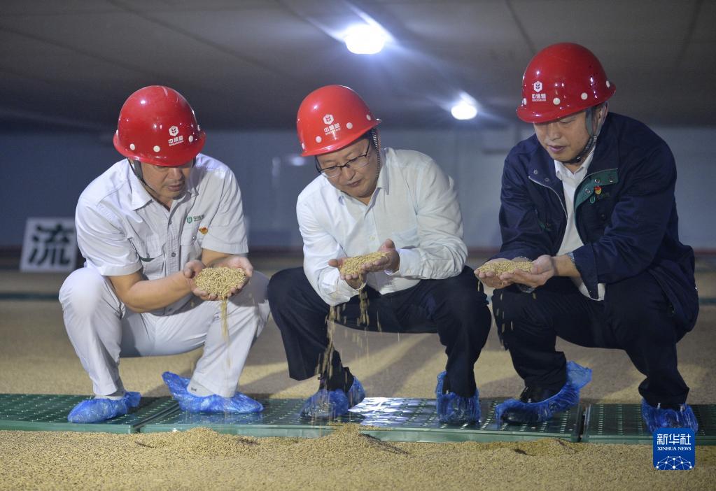 9月23日,在位于四川省眉山市的中央儲備糧眉山直屬庫,付鵬程(中)在了解糧食儲藏情況。