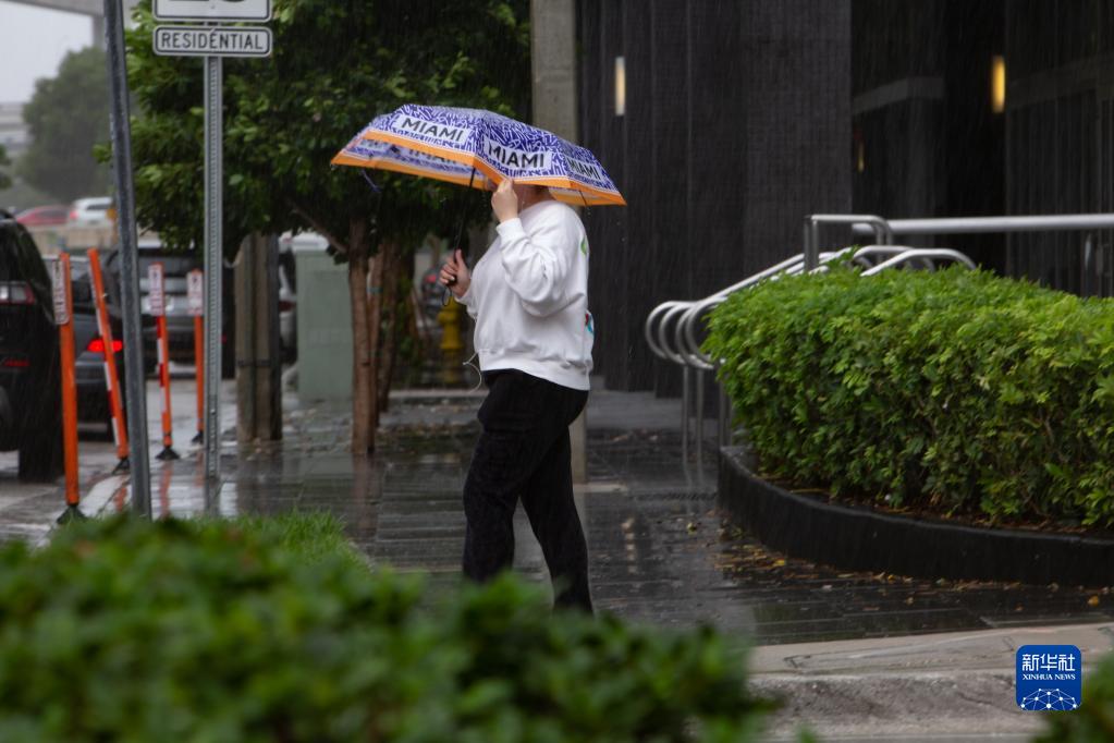 9月27日,在美國佛羅里達州邁阿密,一名女子走在雨中。