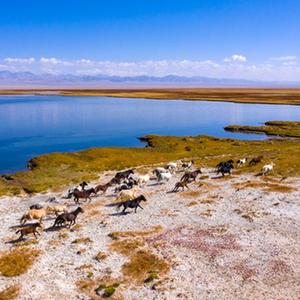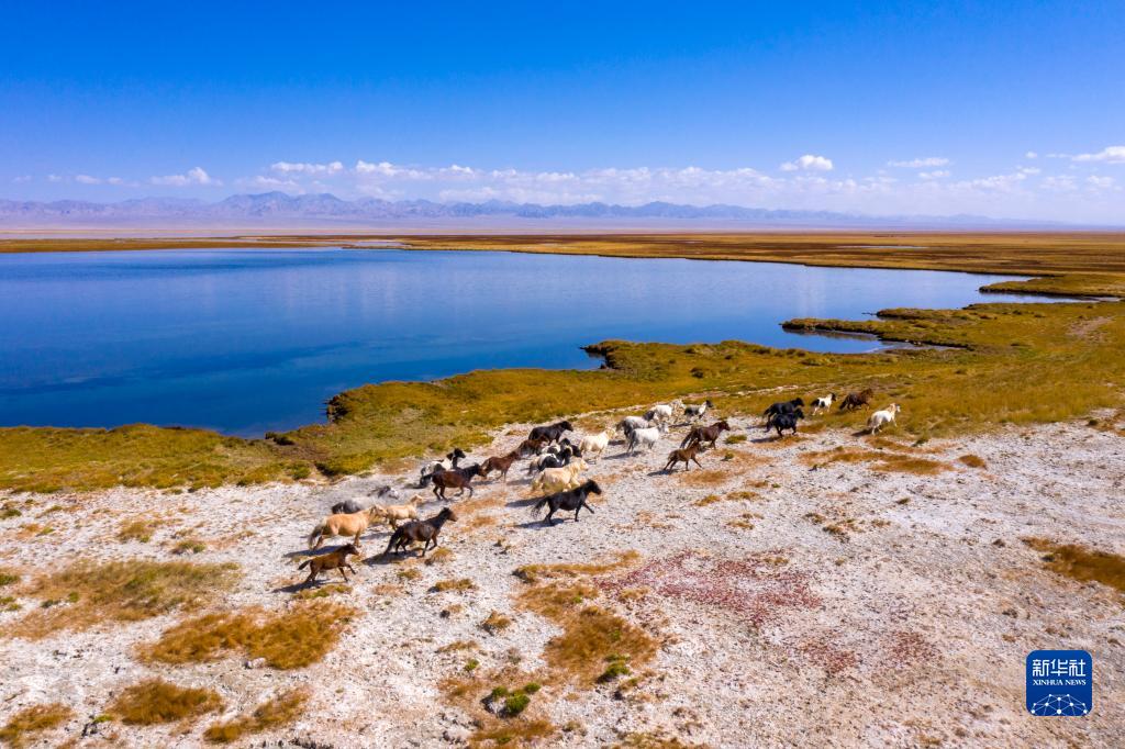 9月27日,一群駿馬在小蘇干湖畔奔跑(無(wú)人機照片)。