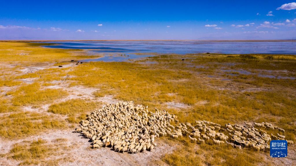 9月27日,牛羊在大蘇干湖畔覓食(無(wú)人機照片)。