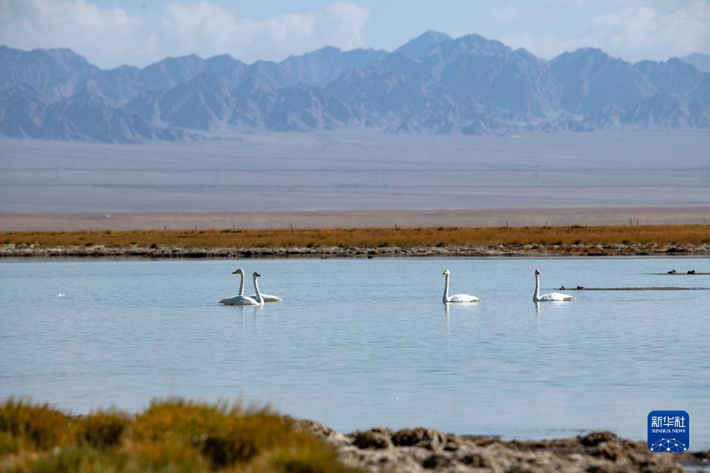 9月27日,天鵝和水鳥(niǎo)在小蘇干湖上游動(dòng)覓食。
