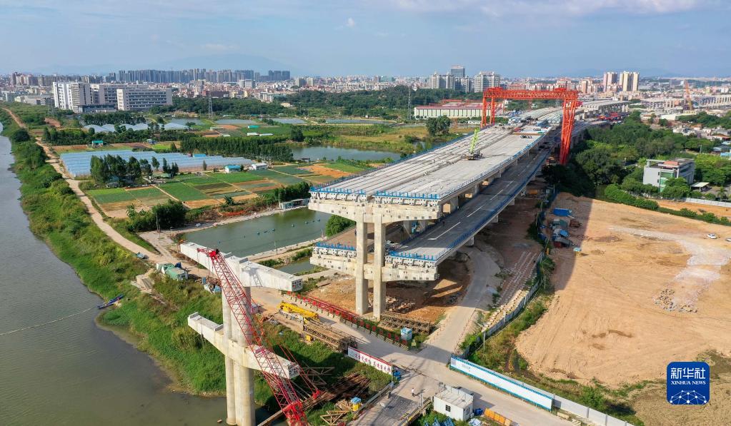 這是9月27日拍攝的莞番高速雙層橋架梁施工現場(chǎng)(無(wú)人機照片)。