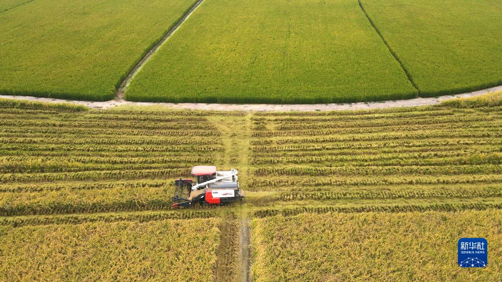 金秋時(shí)節,安徽省合肥市肥西縣花崗鎮河豐社區中稻陸續成熟,當地農民搶抓晴好天氣收割水稻,田間地頭一派豐收景象。