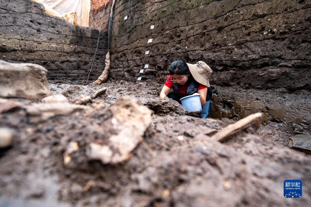 考古工作者在云南河泊所遺址現場(chǎng)進(jìn)行清理發(fā)掘工作(2022年9月21日攝)。
