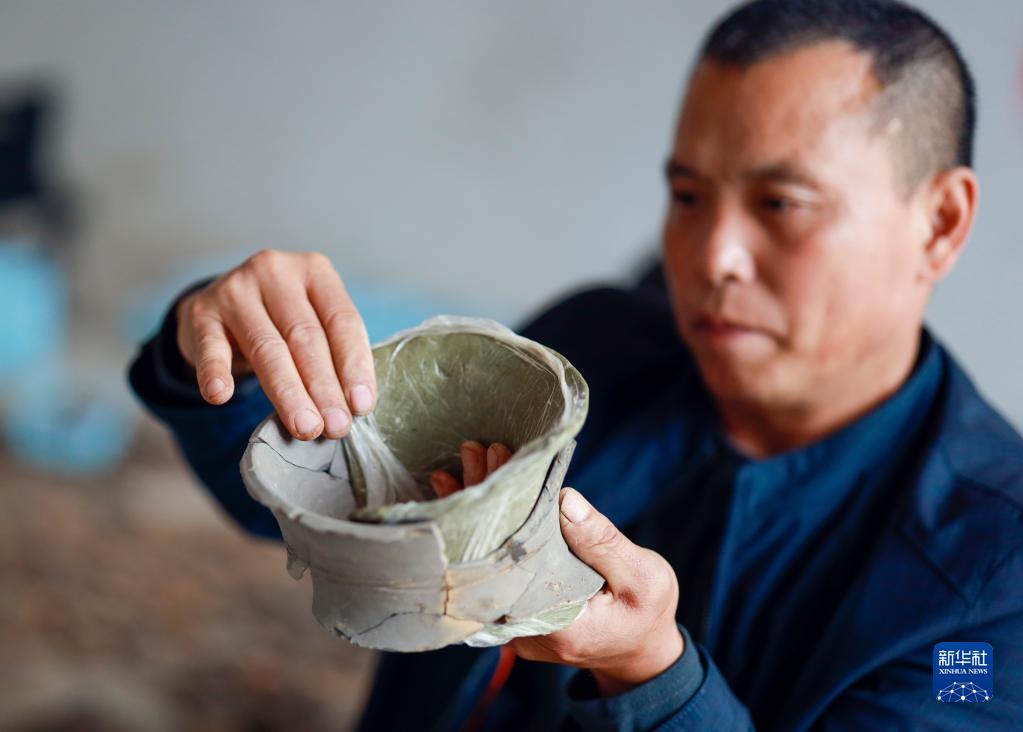 9月27日,考古發(fā)掘隊隊員秦彬在臨時(shí)庫房?jì)?,對一個(gè)剛完成拼對的陶器進(jìn)行初步修復。