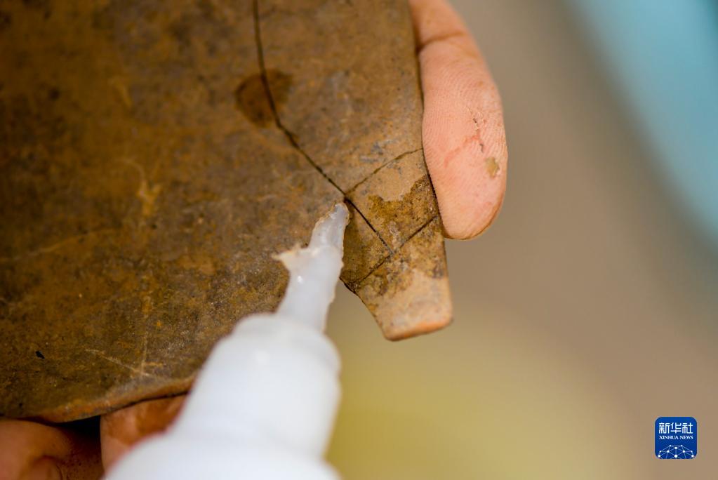 9月27日,考古發(fā)掘隊隊員王朋成在臨時(shí)庫房?jì)?,用膠水拼接出土的陶器。
