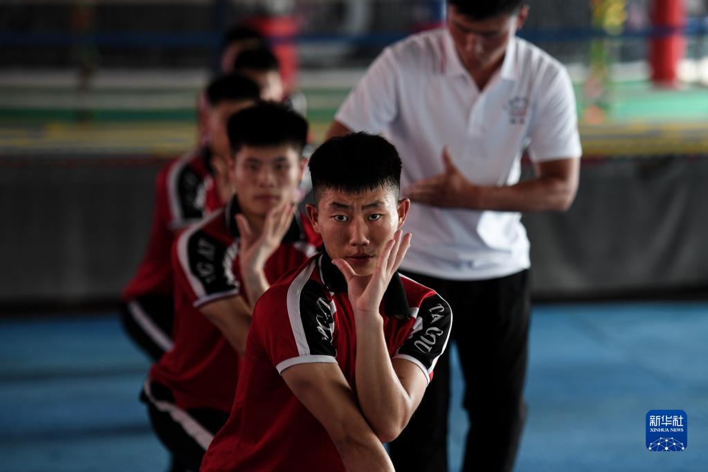這是河南嵩山少林塔溝武校的學(xué)生在李迎港的指導下上課(2022年7月6日攝)。