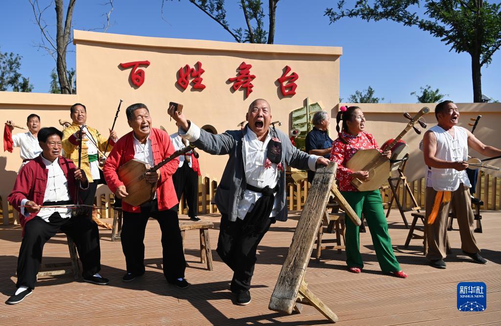 西北綜勘黃河老腔藝術(shù)團藝人在潼關(guān)縣百姓舞臺“黃河老腔”廣場(chǎng)為群眾演出(9月26日攝)。