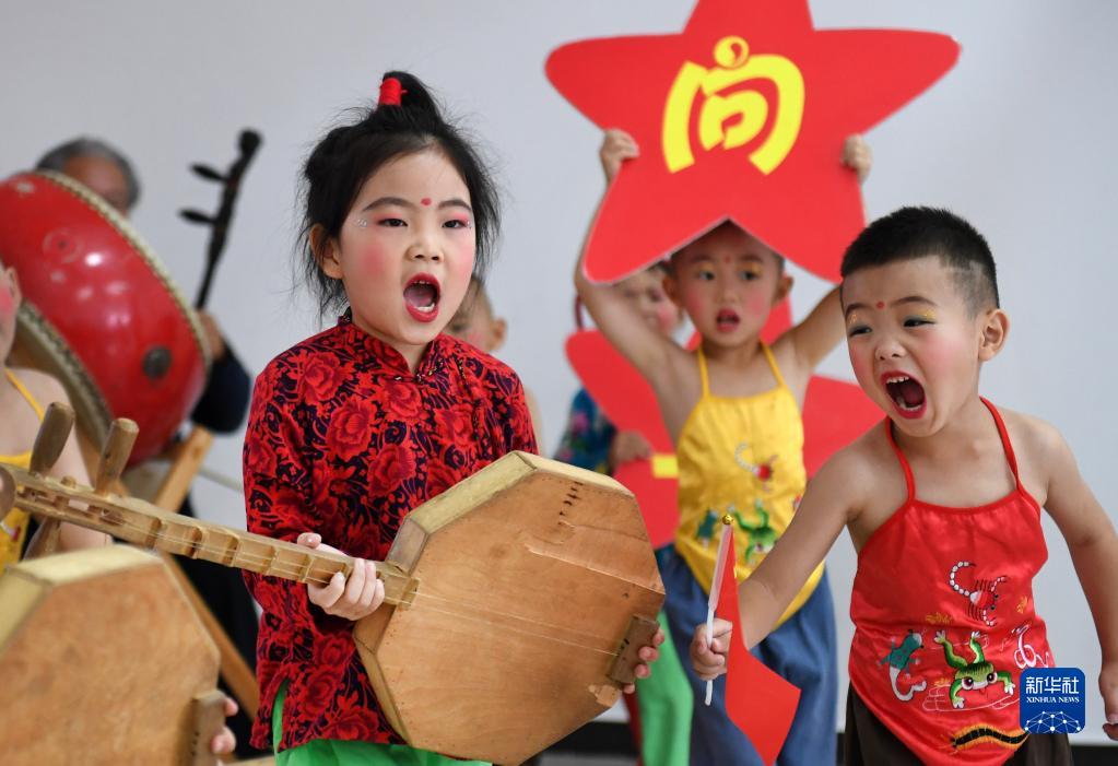 潼關(guān)縣城關(guān)北區幼兒園的孩子們表演“黃河老腔”(9月27日攝)。