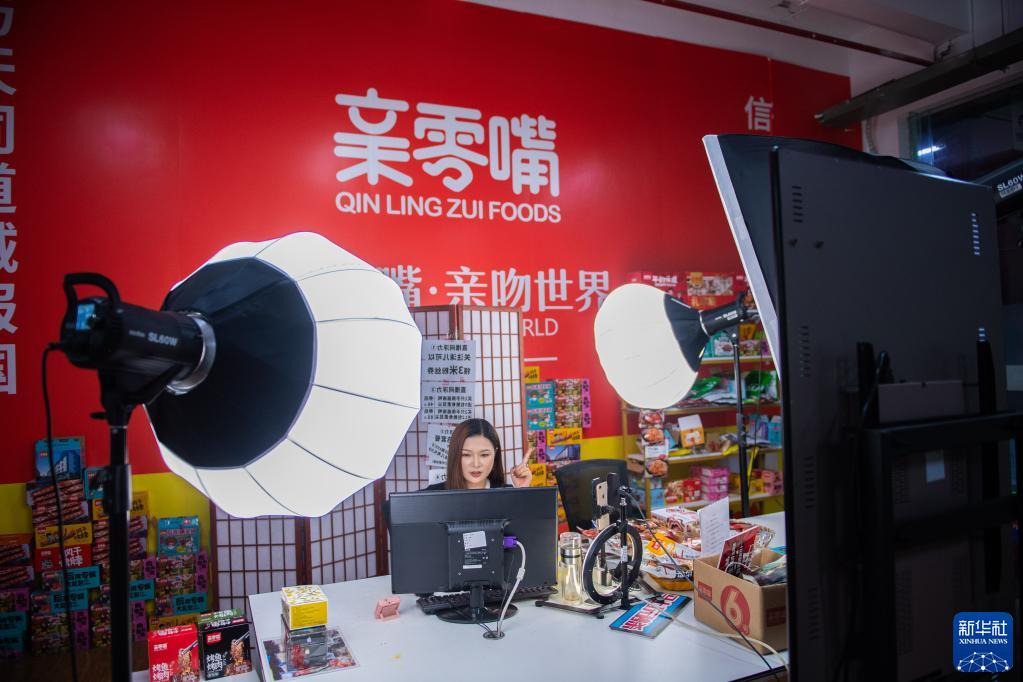 9月29日,在位于常德科技創(chuàng )新創(chuàng )業(yè)孵化產(chǎn)業(yè)園的湖南親零嘴食品有限公司,工作人員直播推銷(xiāo)零食。
