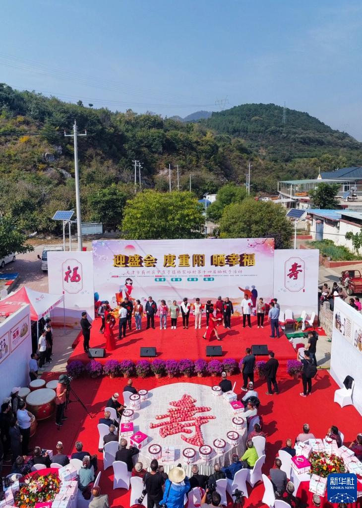 9月28日,在天津市薊州區羅莊子鎮楊家峪村,村民們參加重陽(yáng)節“曬被子”活動(dòng)(無(wú)人機照片)。