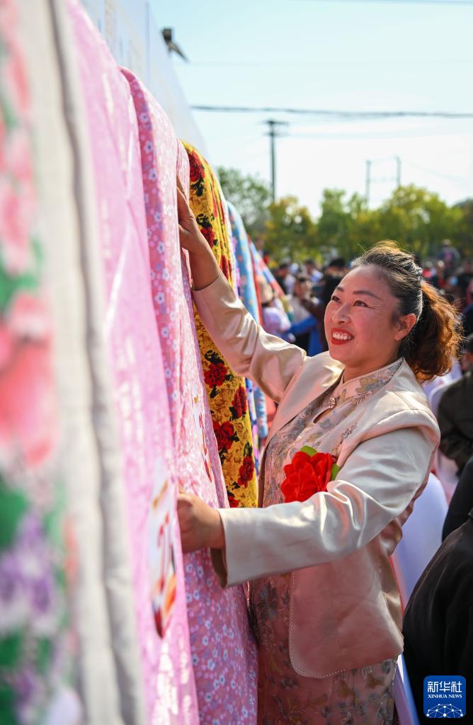 9月28日,在天津市薊州區羅莊子鎮楊家峪村,村民在重陽(yáng)節“曬被子”活動(dòng)中整理被子。
