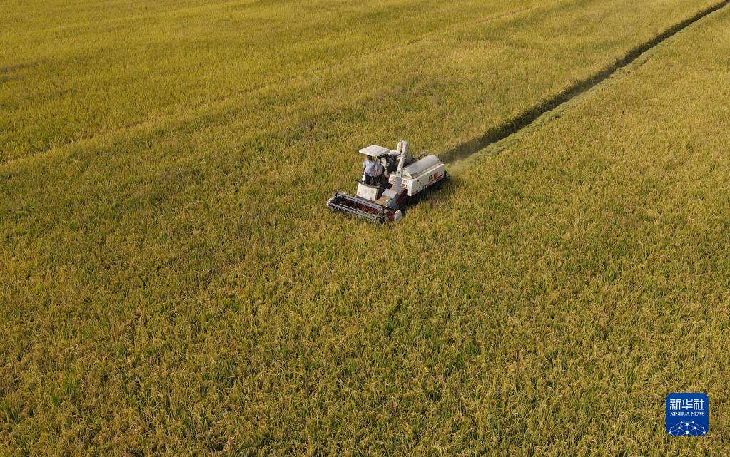 9月29日,安徽省合肥市肥東縣古城鎮農民駕駛收割機收獲水稻(無(wú)人機照片)。