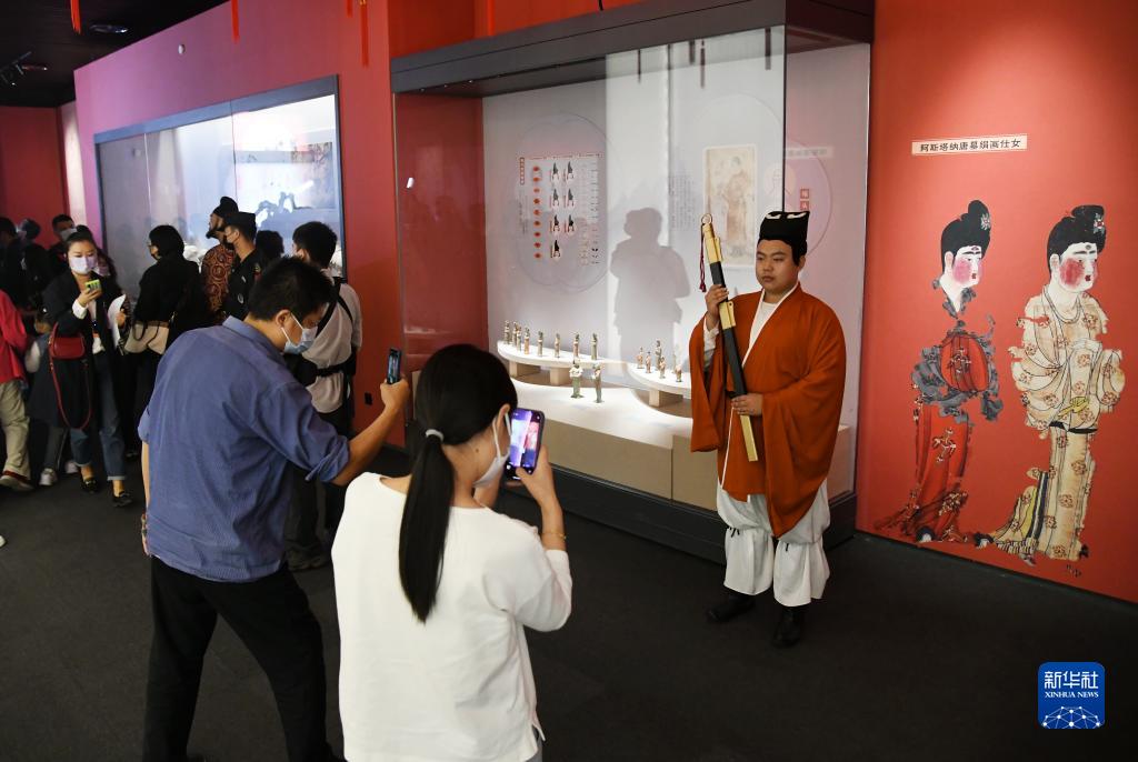 9月30日,演員身著(zhù)復原的唐裝為觀(guān)眾呈現大唐金鄉縣主展上展出的文物風(fēng)貌。