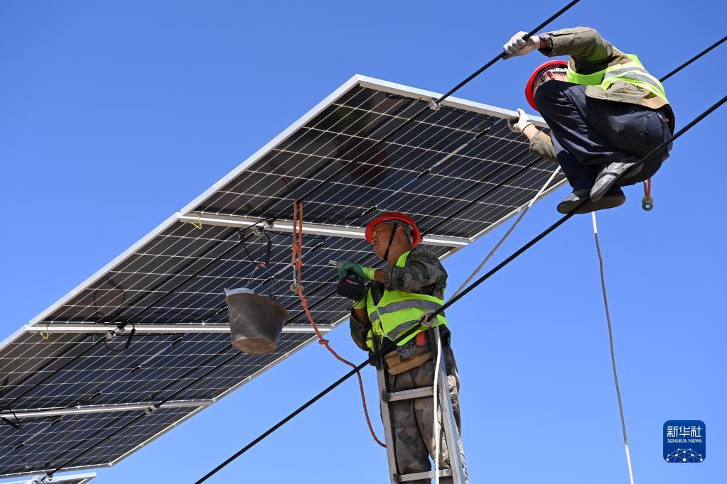 9月29日,在位于甘肅省武威市涼州區的甘肅武威50萬(wàn)千瓦立體光伏治沙產(chǎn)業(yè)化示范項目建設現場(chǎng),施工人員在安裝光伏板。