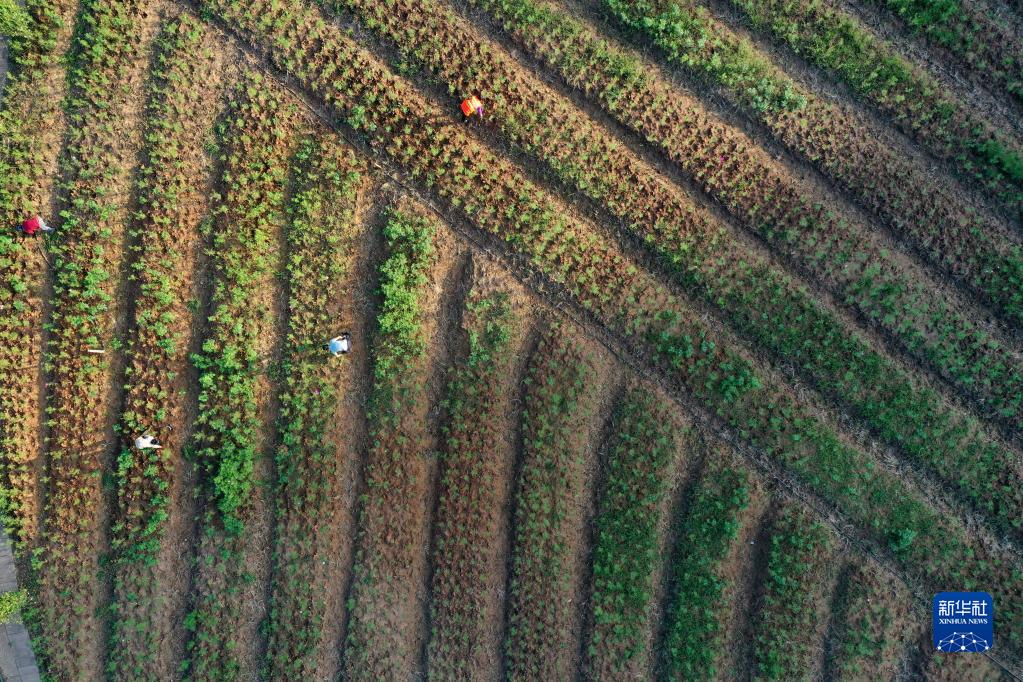 2022年9月28日,在四川瀘州納溪區大渡口鎮,工人在長(cháng)江支流清溪河岸邊綠地養護林木。