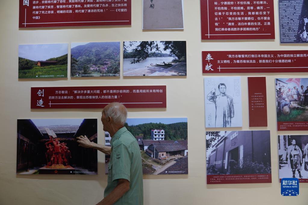 9月23日,程樟柱在紀念館里撫摸著(zhù)展板墻。