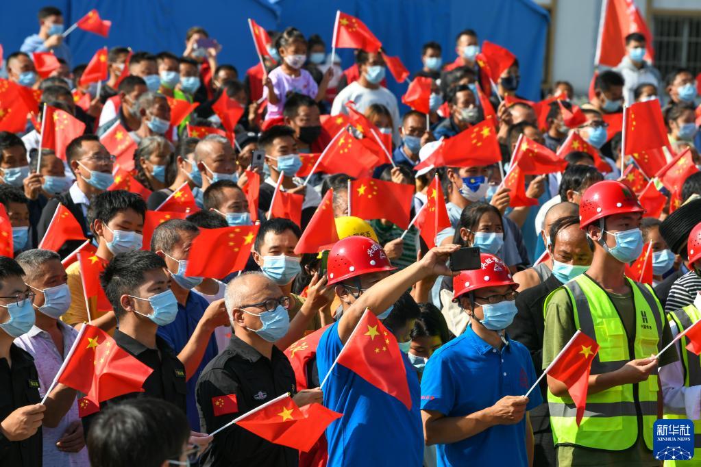 10月1日,在四川省甘孜州瀘定縣得妥鎮天池山村繁榮集中過(guò)渡安置點(diǎn),人們在升國旗儀式后揮舞國旗。