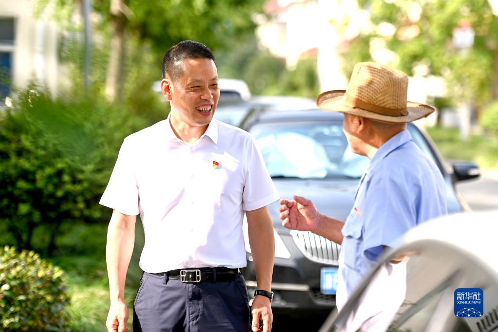 在浙江省寧波市奉化區蕭王廟街道滕頭村,傅平均(左)與一名老人交談(9月16日攝)。