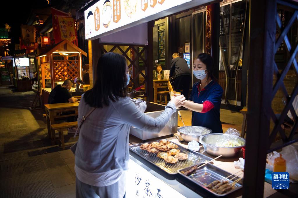 游客在太原古縣城內購買(mǎi)小吃(9月30日攝)。