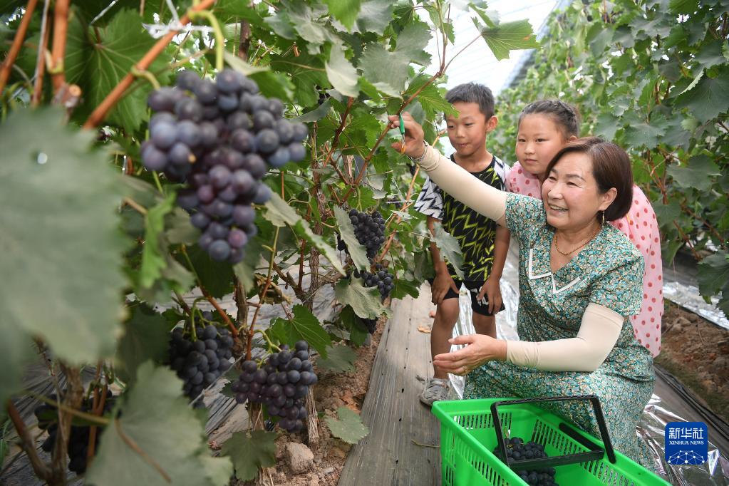 7月5日,在位于黃河岸邊的寧夏青銅峽市大壩鎮韋橋村,游客觀(guān)光采摘大棚內采摘葡萄。