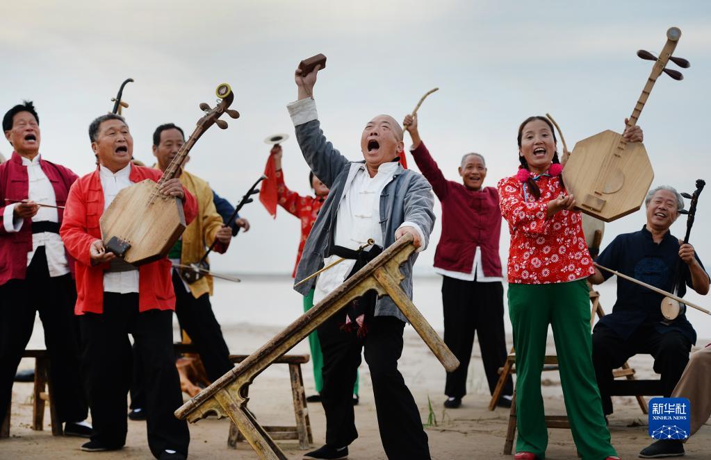 9月26日,在陜西省渭南市潼關(guān)縣,西北綜勘黃河老腔藝術(shù)團藝人在黃河岸邊表演黃河老腔。
