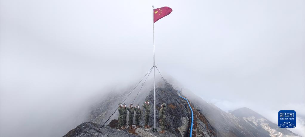10月1日,西藏亞?wèn)|海拔4655米的詹娘舍哨所官兵在哨所旁的崖壁上舉行升旗儀式。