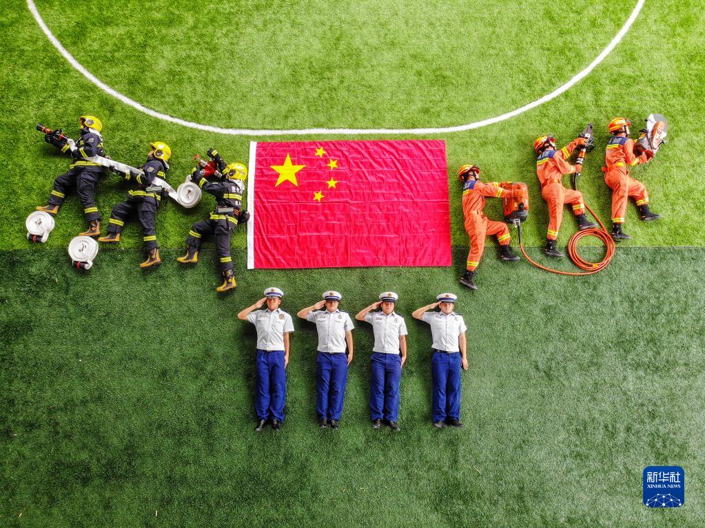 10月1日,貴州省遵義市的消防隊員在“我和國旗合個(gè)影”主題活動(dòng)中拍照。
