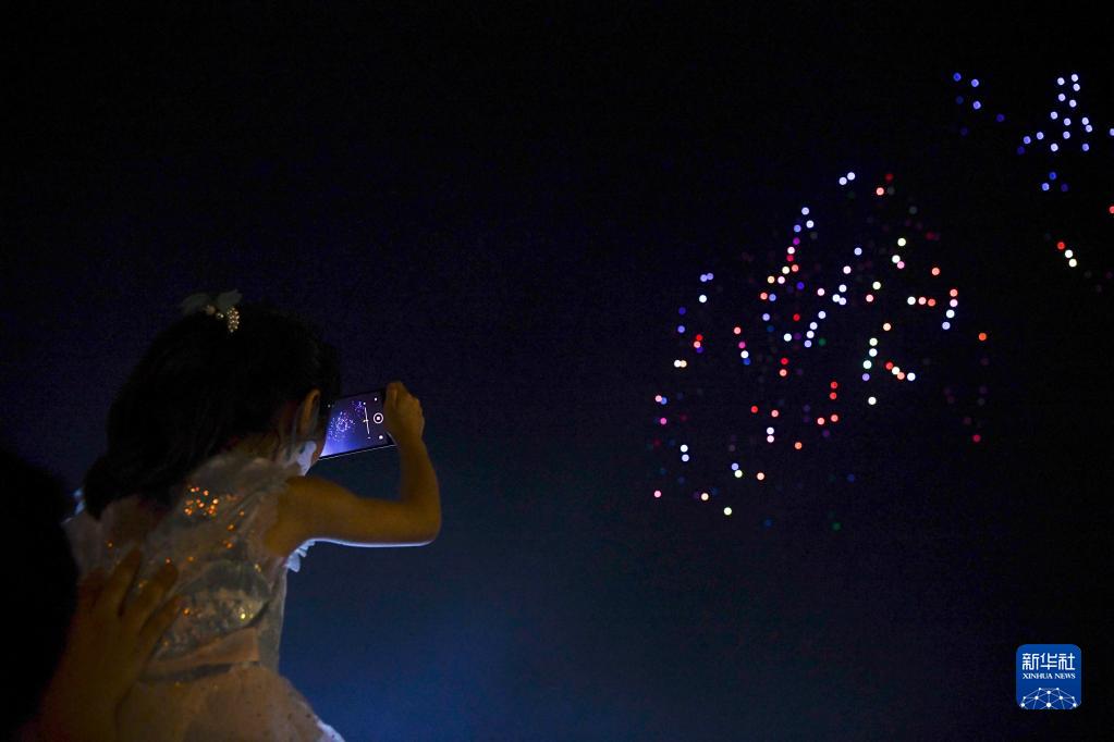 10月1日,在安徽省蕪湖市方特東方神畫(huà)游樂(lè )園,小朋友在拍攝無(wú)人機燈光秀。