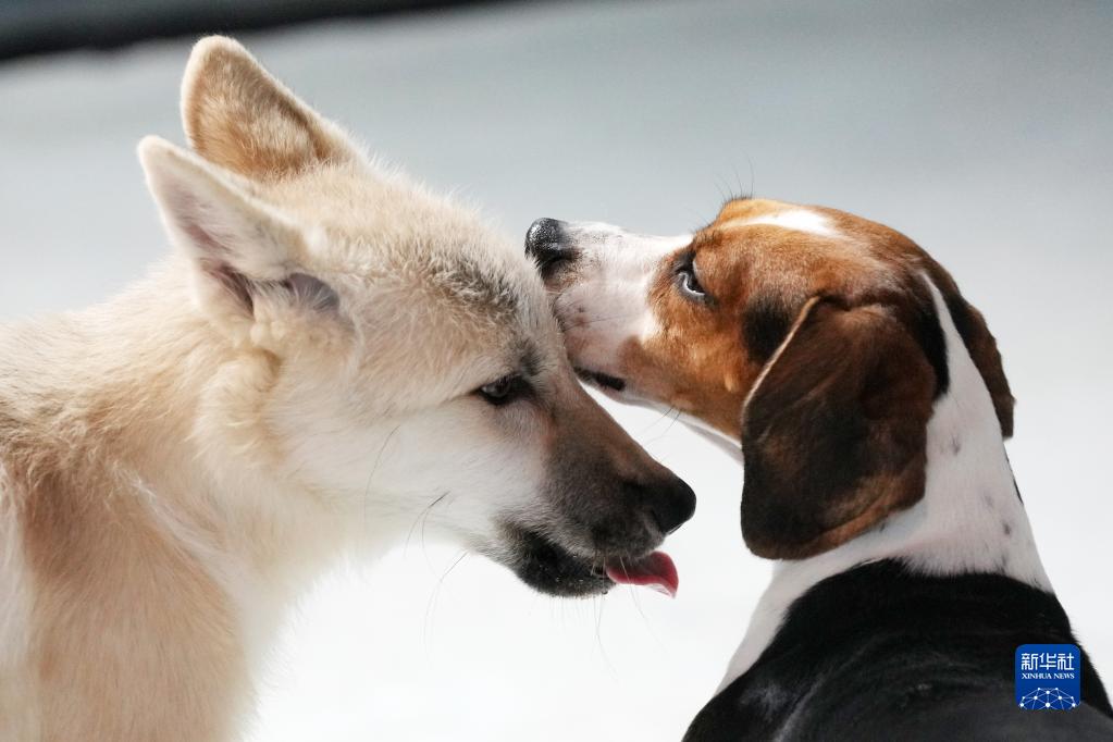 9月26日,在哈爾濱極地公園內,克隆北極狼(左)和它的代孕母體比格犬在一起。