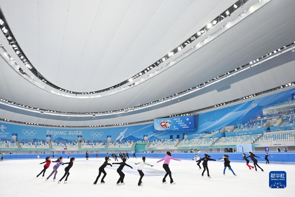 10月1日,青少年在“冰絲帶”內參加花樣滑冰培訓。