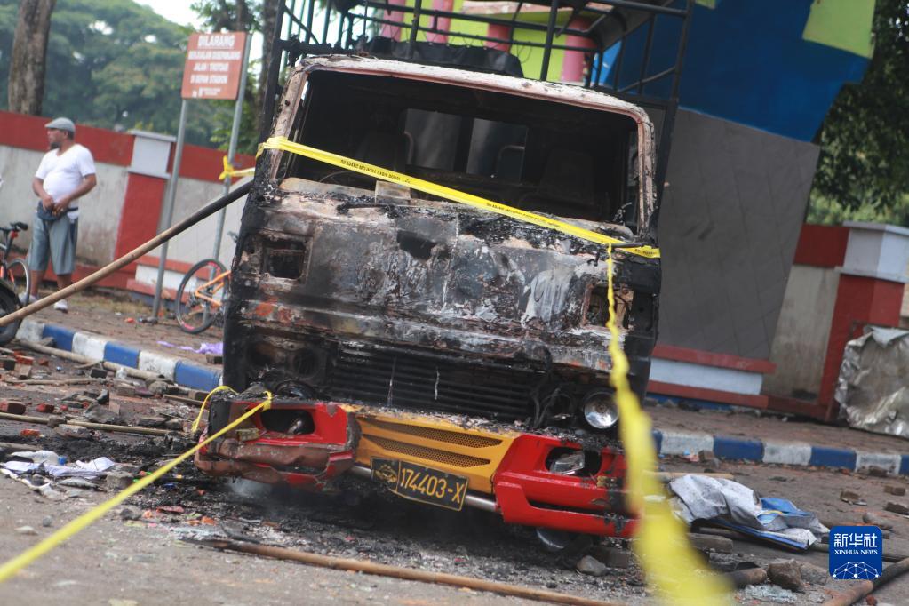這是10月2日在印度尼西亞?wèn)|爪哇省瑪瑯市事發(fā)球場(chǎng)外拍攝的被焚毀的車(chē)輛。新華社發(fā)(巴尤·諾凡塔攝)