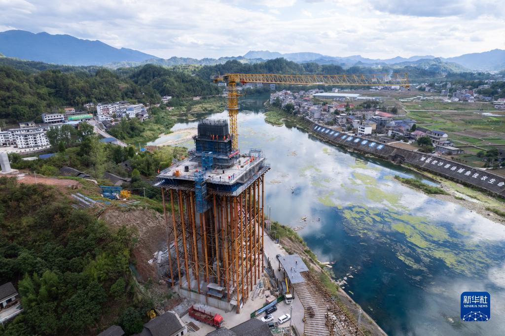 10月2日,在湖南桑龍高速賀龍特大橋建設現場(chǎng),中鐵五局工人在施工作業(yè)(無(wú)人機照片)。