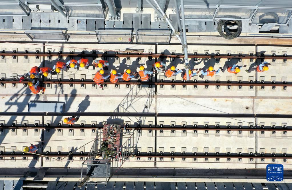 10月2日,浙江省溫州軌道交通S2線(xiàn)樂(lè )清段建設工地,工人在軌道線(xiàn)上拉線(xiàn)纜(無(wú)人機照片)。