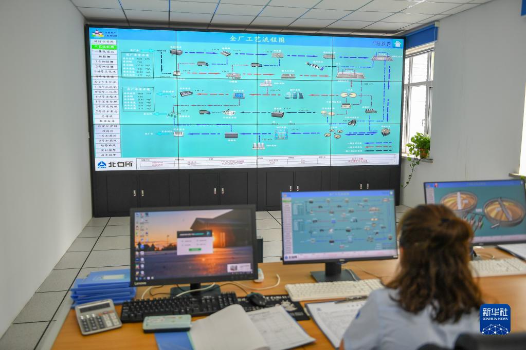 在吉林省遼源市中核遼源環(huán)??萍加邢薰?,工作人員監控污水處理設備狀態(tài)(2022年7月5日攝)。