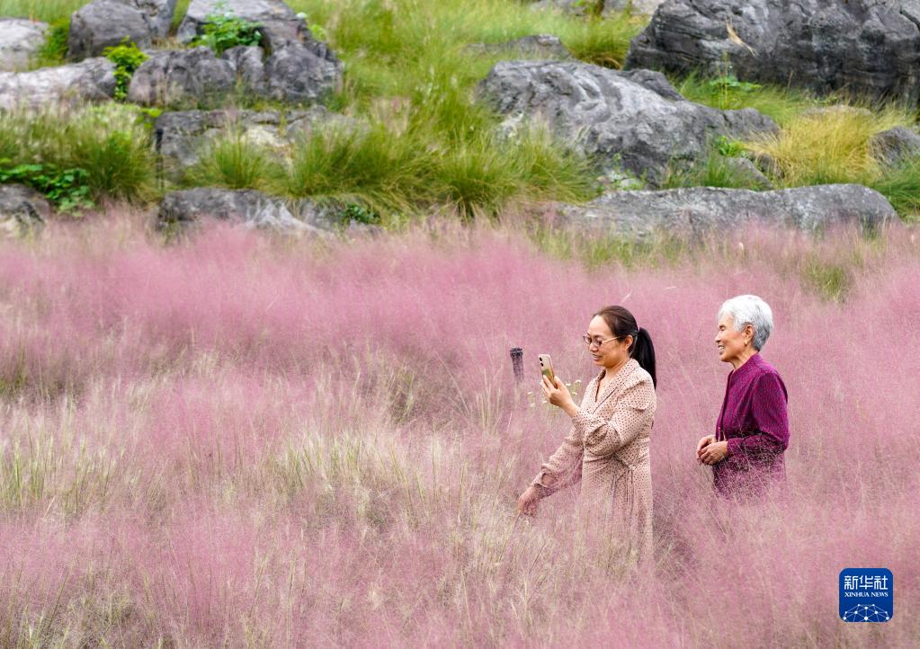 10月2日,游客穿行在疊石花谷景區內粉黛亂子草組成的粉色花海中。