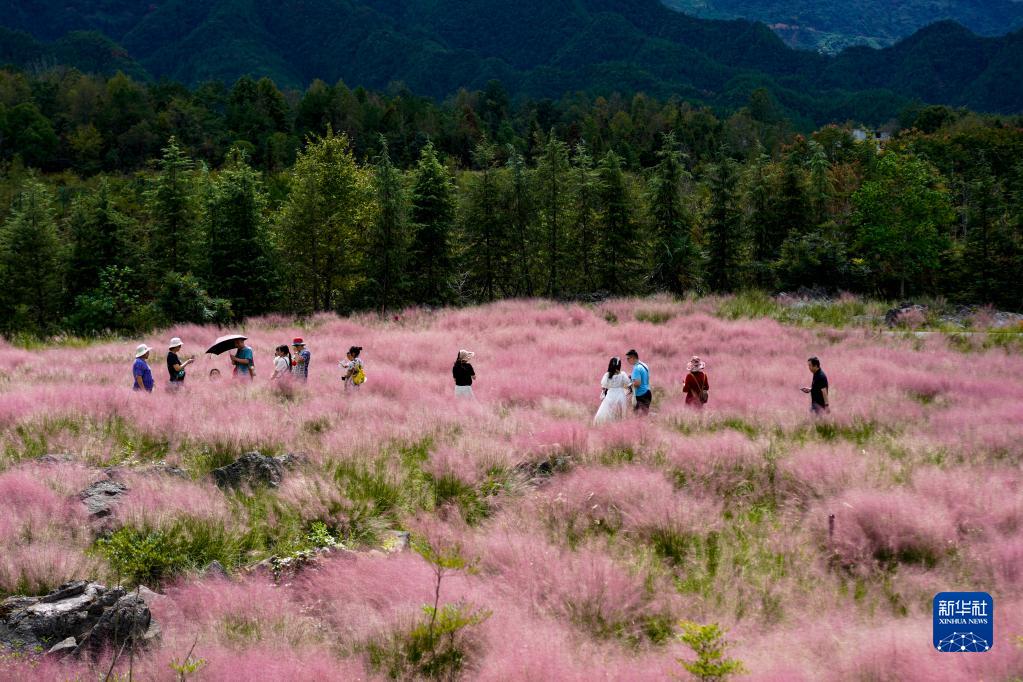 10月2日,游客在疊石花谷景區內粉黛亂子草組成的粉色花海中游玩。