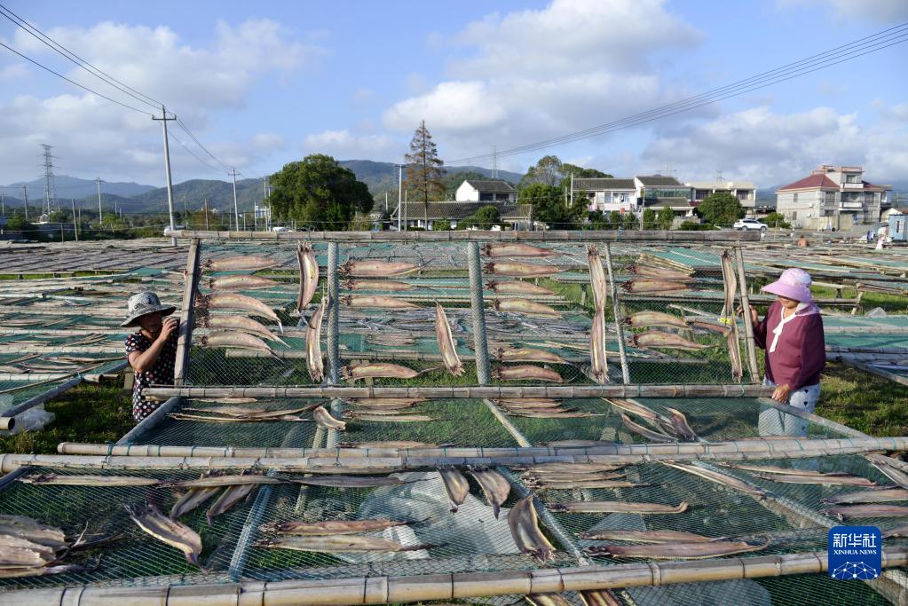 10月2日,兩名婦女在浙江省舟山市普陀區東港街道翻曬魚(yú)干。